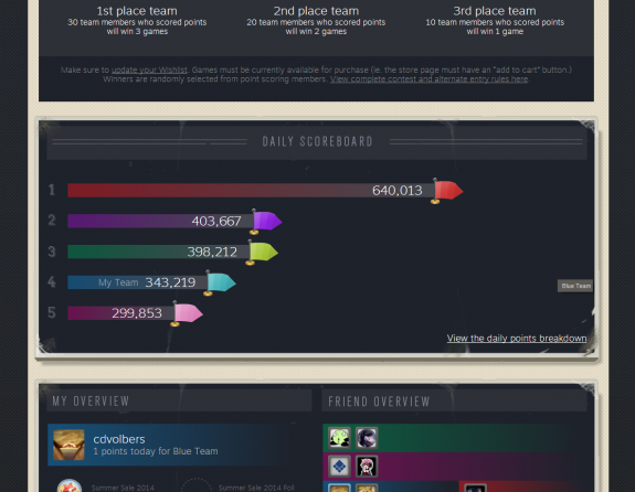 Doch dieses Jahr ist es etwas anders: Denn jedes Abzeichen bringt Punkte für das Team, in das uns Valve gesteckt hat. Fünf davon gibt es, und jeden Tag kämpfen sie um die meisten Punkte, damit es weitere Sammelkarten gibt. Außerdem erhalten dreißig zufällige Mitglieder des Gewinner-Teams drei Spiele aus ihrer Wunschliste, kostenlos.