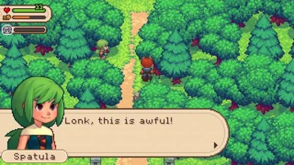 Letztendlich läuft es darauf hinaus, eine Katastrophe zu verhindern – wie immer. Ich bin mir nicht sicher, ob das den 08/15-Plot parodieren soll, den das Genre immer und immer wieder durchkaut; denn dafür müsste das Spiel die eigene Geschichte konsequenter durch den Kakao ziehen. Kritisch gibt sich Evoland 2 jedoch nur selten: In einem verlassenen Labor kämpfen Lonk, Spatula und Dimp zum Beispiel mit rostigen Wachrobotern und alten Sicherheitscomputern. Dabei finden die Kämpfe auf eine Weise statt, die an Chrono Trigger erinnert. Lonks Begleiterin Dimp fragt, ob das denn nicht Spaß mache. Ich verneine, und sie antwortet: „Das ist das Schwierige an diesen Systemen – man weiß nie, wie gut sie altern.“