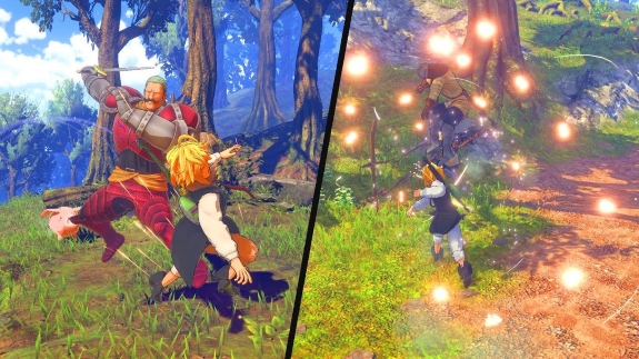 Und das nicht ganz zu unrecht. In den Kämpfen, in denen ihr gegen Wellen von Gegnern antreten müsst, spielt es sich fast exakt so wie ein Warriors-Spiel. Ihr habt einen leichten und harten Angriff, könnt schießen, springen, Spezialattacken abfeuern und müsst euch obendrein noch zwischen den 3 Charakterklassen Geschwindigkeit, Macht und Magie entscheiden. Doch wo Seven Deadly Sins punkten kann, sind die Zweierkämpfe, denn hier hat man nun das Gefühl man spiele einen der „Ultimate Ninja“-Teile von Naruto. Die Bewegungen der Figuren und das Kontern funktionieren fast 1 zu 1 wie in der beliebten Naruto-Serie. Das war wirklich eine willkommene Überraschung und hat das Spiel umso spaßiger gemacht. Was aber direkt beim ersten Kampf ins Auge sticht, ist der große Zähler in der rechten Ecke.
