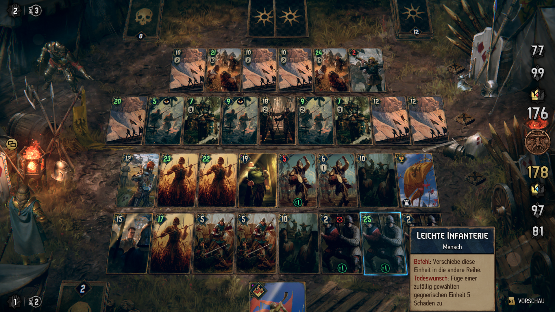 Die Besonderheit hier, im Vergleich zu den meisten anderen Spielen dieser Art, ist aber die Anzahl der Runden. Wo Spiele wie Magic: The Gathering kontinuierlich weitergehen, bis einer der Kontrahenten geschlagen ist, müssen in Gwent drei (bzw. zwei siegreiche) Runden überstanden werden. Da ihr nur begrenzt Karten nachziehen könnt, müsst ihr euch also gut überlegen wann ihr welche Karten einsetzt. Habt ihr euch beispielsweise in der ersten Runde in eine aussichtslose Situation manövriert, kann es durchaus ratsam sein den taktischen Rückzug anzutreten um in der nächsten Runde neu durchzustarten.